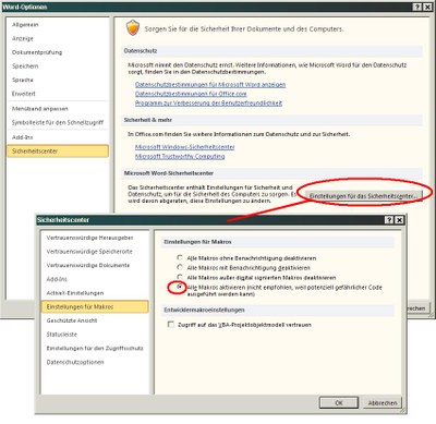 Ab WORD 2010 finden Sie die Einstellungen im Menü DATEI | Optionen | Sicherheitscenter | Einstellungen für das Sicherheitscenter | Einstellungen für Makros (siehe Bild1). Ansonsten stehen möglicherweise nicht alle Funktionalitäten des Formulares zur Verfügung.